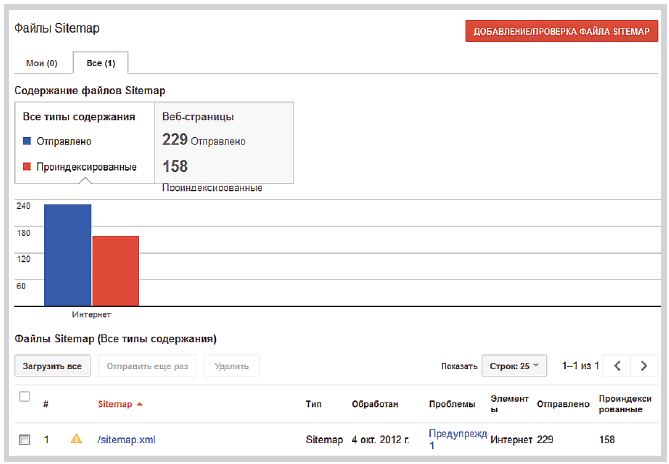 В данном разделе собраны инструменты для оптимизации сайта. Сервис «Файлы Sitemap» показывает всю информацию о файле sitemap.xml: когда проиндексирован, сколько обнаружено ссылок на страницы, сколько из этих страниц проиндексированы, есть ли ошибки в sitemap.xml и т.д.